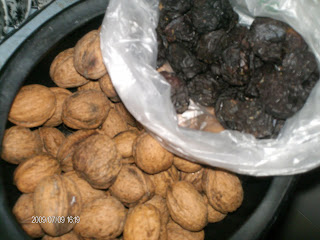 Nozes, abrunhos secos, uma grande abóbora que já está destinada à ceia de natal e uma garrafa de jeropiga.